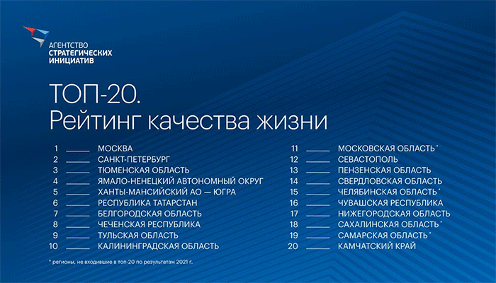 Возглавили рейтинг оценки усилий региональных властей по созданию качественной среды для жизни граждан Москва, Петербург и Тюменская область, сообщила гендиректор Агентства стратегических инициатив Светлана Чупшева.