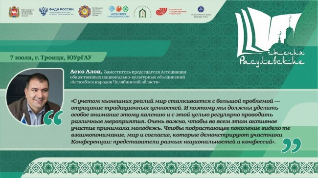 В Троицке 7-8 июля состоится IV Международная ХII Всероссийская научно-практическая конференция «Расулевские чтения: ислам в истории и современной жизни России». В этом году мероприятие будет посвящено теме «Традиционные конфессии на защите Отечества и духовных ценностей». В преддверии события заместитель председателя Ассоциации общественных национально-культурных объединений «Ассамблея народов Челябинской области», член Общественной палаты региона Аско Алои высказался о роли Чтений в воспитании молодежи, сообщают организаторы.
