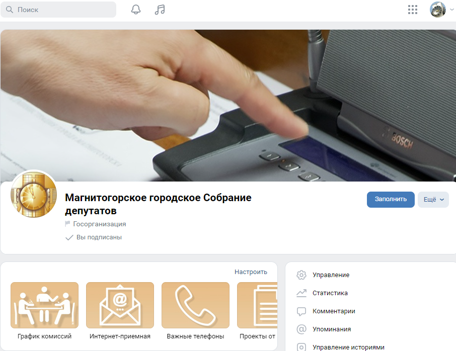 Городское Собрание ведет группу в "ВКонтакте" с 2014 года. С 2022 года статус страниц стал официальным, об этом соответствует отметка "госорганизация".