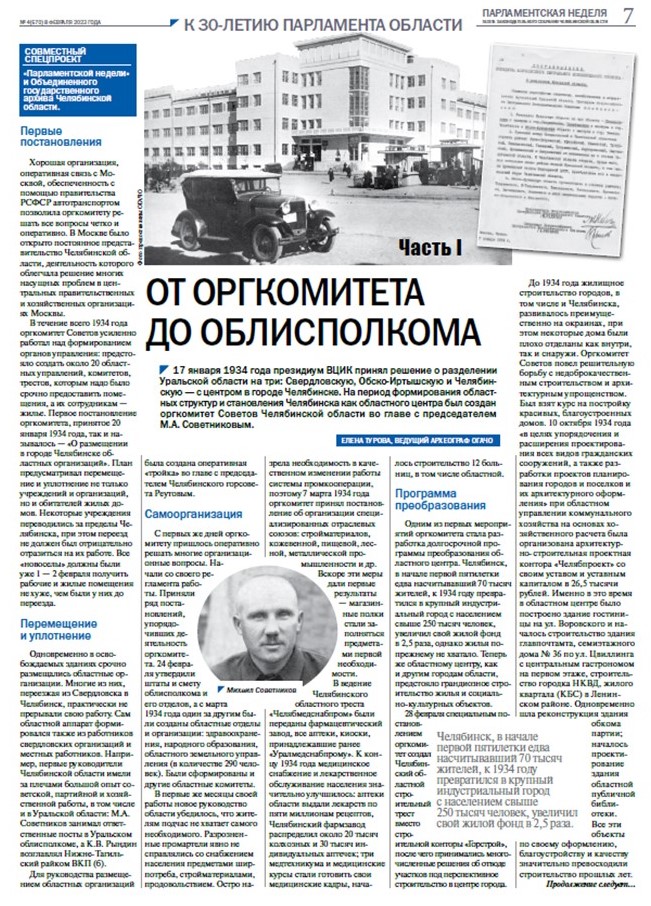17 января 1934 года президиум ВЦИК принял решение о разделении Уральской области на три: Свердловскую, Обско-Иртышскую и Челябинскую — с центром в городе Челябинске. На период формирования областных структур и становления Челябинска как областного центра был создан оргкомитет Совета Челябинской области во главе с председателем М.А. Советниковым. Казалось бы, время далекое от нас – прошло 89 лет. И все же интерес к истории Челябинской области не ослабевает. Какие первые постановления принял оргкомитет, какие изменения происходили в новом субъекте страны Советов, кто встал у руля областной власти, как протекала жизнь южноуральцев в начале 1930-х годов? Эти и многие другие вопросы освещает в своей статье «От оргкомитета до облисполкома» в газете «Парламентская неделя» главный архивист Объединенного государственного архива Челябинской области Е.П. Турова. Статья опубликована в рамках совместного проекта газеты «Парламентская неделя» Законодательного собрания Челябинской области и Объединенного государственного архива.