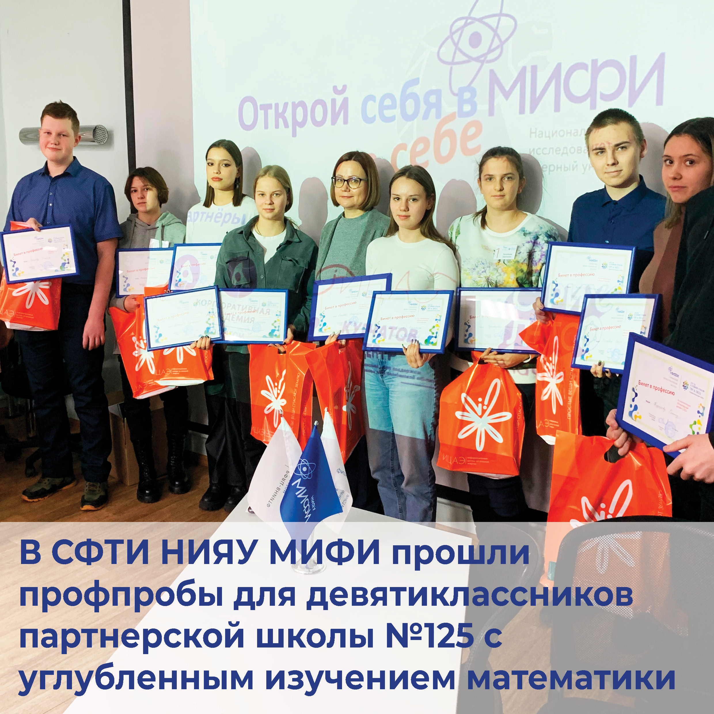В будущем году в школе №125 появится новый инженерный класс, сформированный из нынешних девятиклассников. Именно для них в СФТИ НИЯУ МИФИ и были организованы профпробы по шести ключевым инженерным компетенциям Росатома и мероприятия по знакомству с миссией атомной отрасли и НИЯУ МИФИ, посвященные, в том числе, 80-летию университета и 120-летию со дня рождения нашего земляка, отца отечественного атомного проекта И.В.Курчатова.