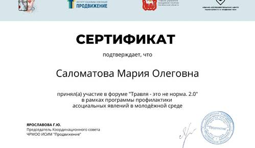 Лидер СНО Саломатова Мария (ЭБ-408) в декабре 2022 г. приняла участие в онлайн-форуме по профилактике буллинга «Травля — это не норма. 2.0», организованном Челябинской региональной молодежной общественной организацией Институт социальных инноваций молодежи «ПРОдвижение».