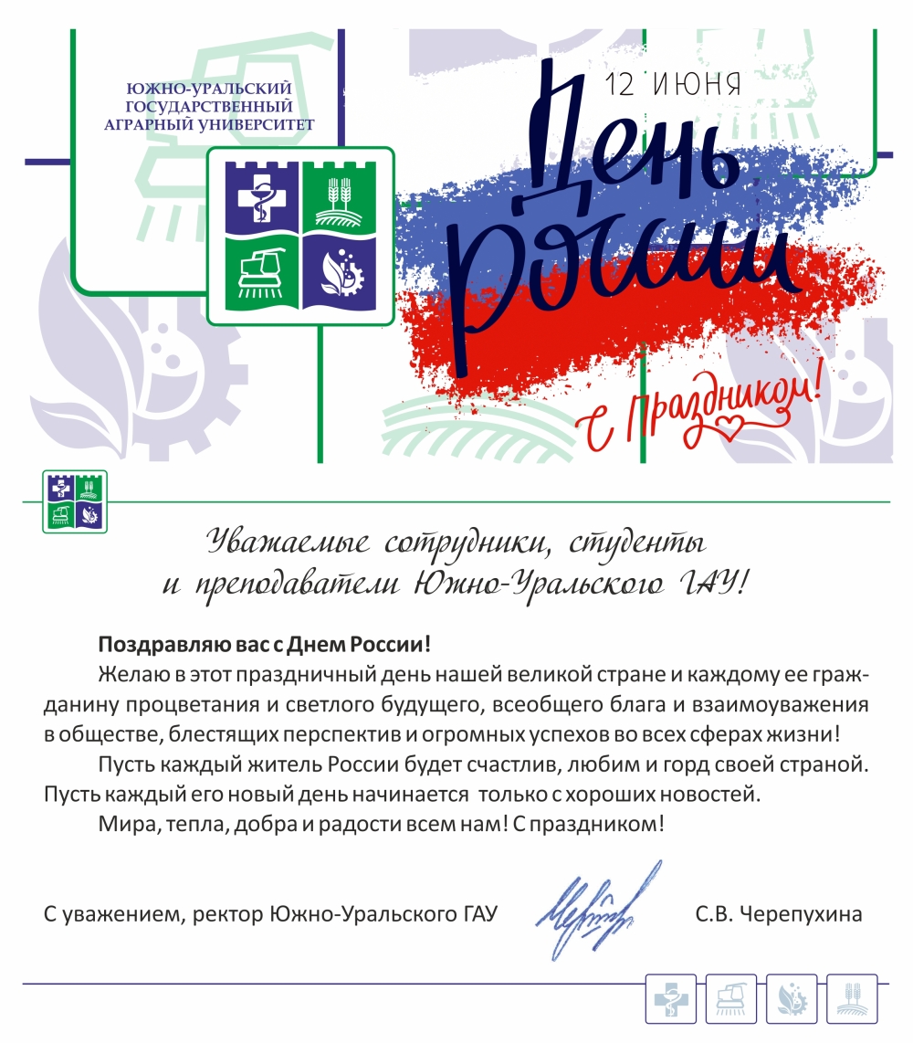 Уважаемые сотрудники, студенты и преподаватели Южно-Уральского ГАУ, поздравляю вас с Днем России!