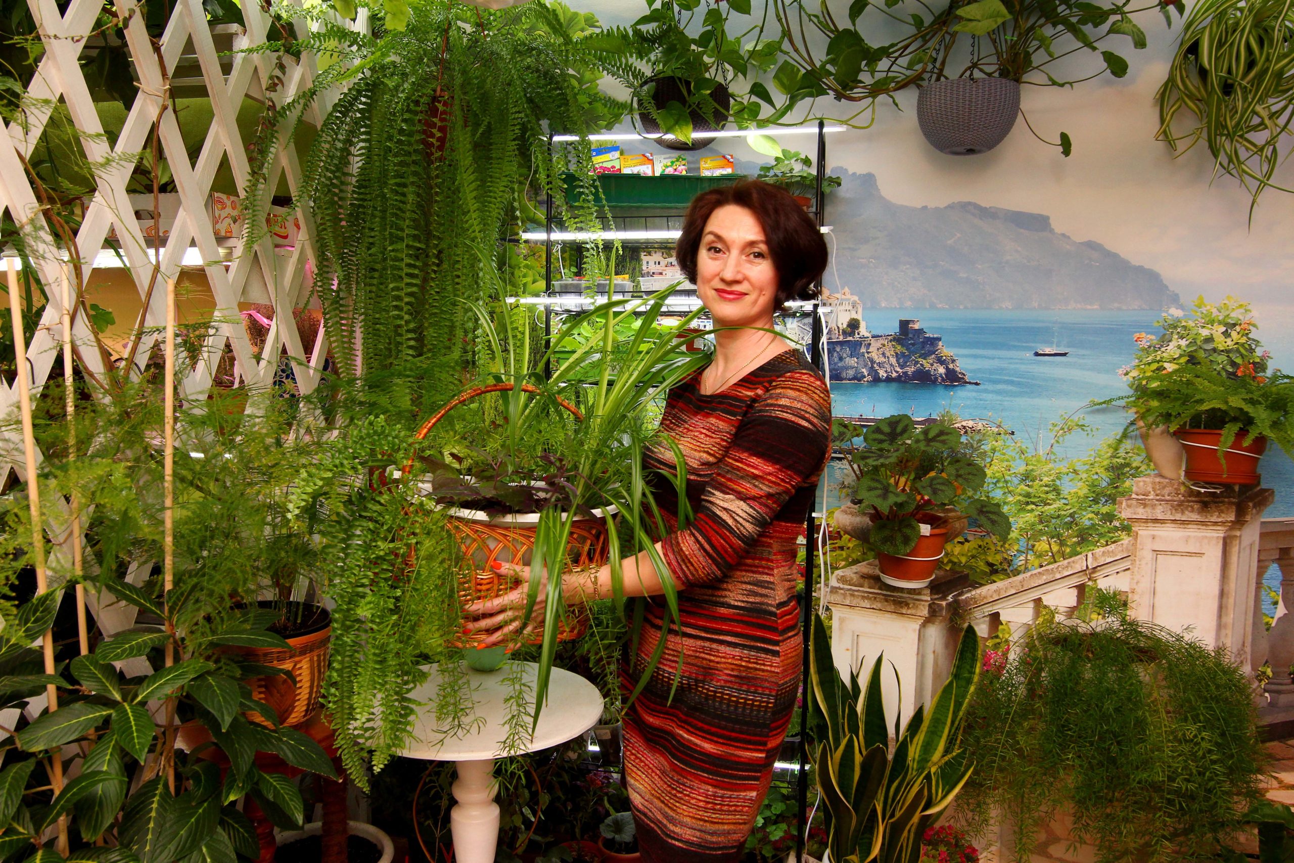 В зимнем саду Натальи произрастает более ста наименований цветов, при этом большинство представлены в нескольких разновидностях. Это примулы, гербера, орхидея, стрептокарпусы, бегонии, папоротники, колеосы, аспарагусы, монстера, пассифлора, спатифиллум, афеландра, гинура, вашингтония, кодиум, фикусы, строманта, дихондра, фиттония, драцена, солейролия. А также цветы для улицы – петуния, анютины глазки, гейхера, целозия, остеоспермум, цинерария, эустома, вербена, бакопа, и многие другие.