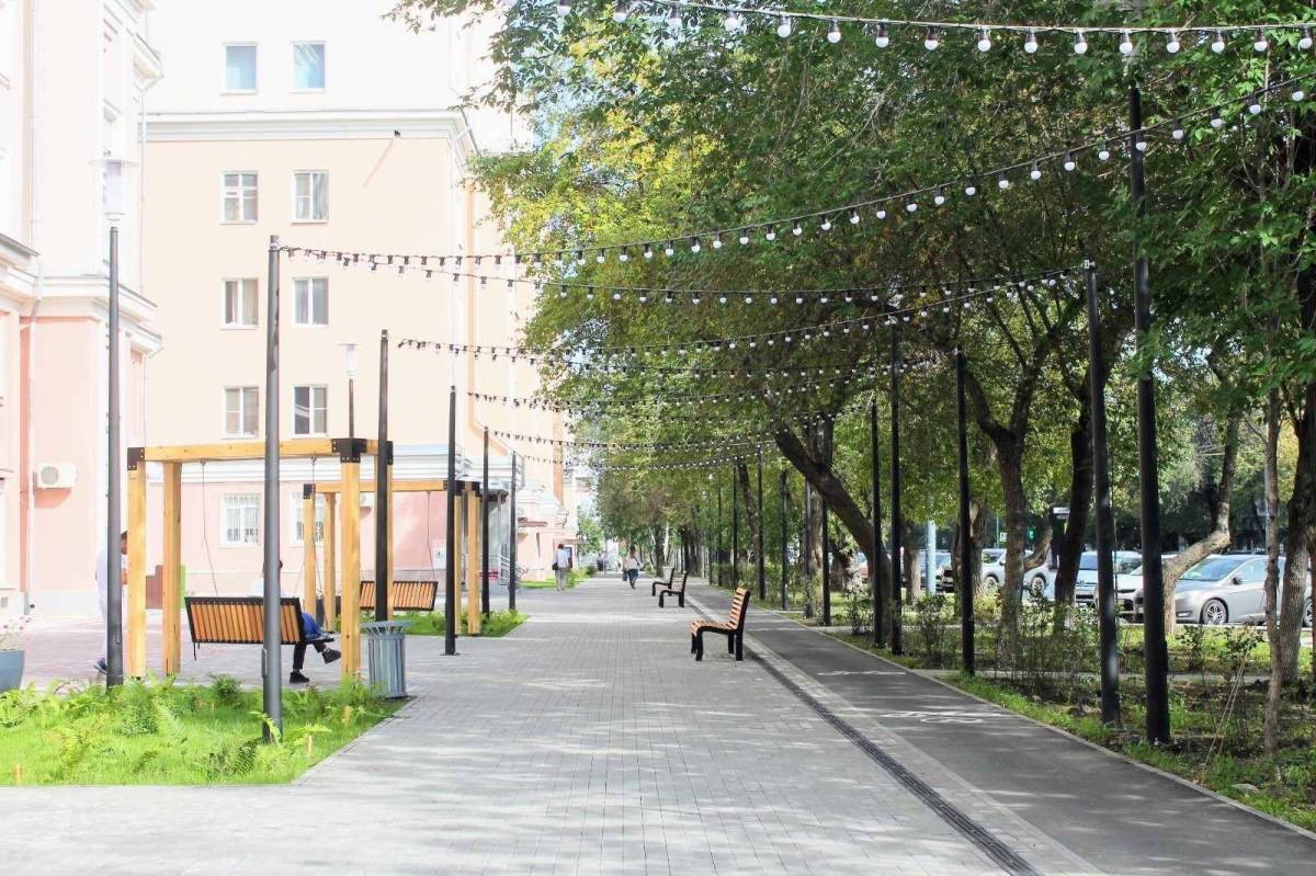 За четыре месяца интенсивных работ на этом участке улицы установлено более 200 малых архитектурных форм: качели с подсветкой, скамейки, урны, приствольные решетки, велопарковки, велостанция, рекламная тумба, стрелочный указатель и ограничительные столбики.
