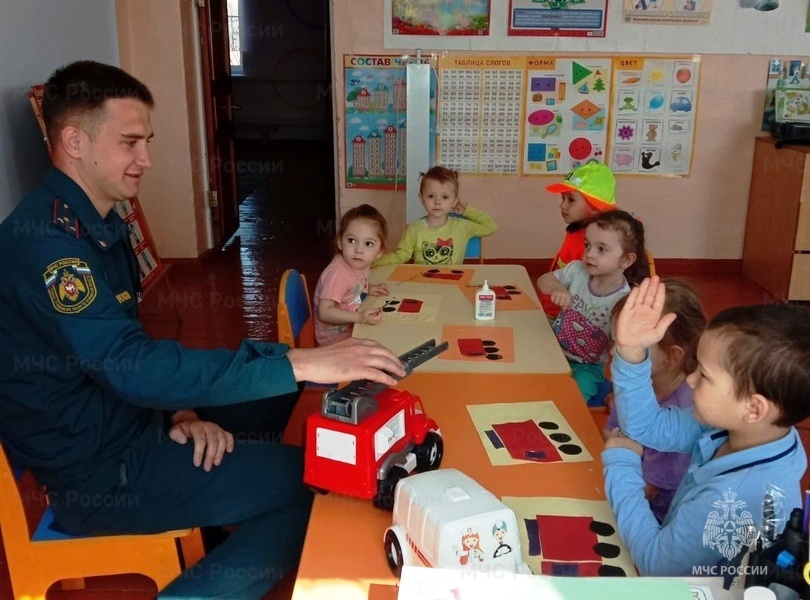 Начальник караула 24-й пожарно-спасательной части города Магнитогорска Николай Костюков посетил детский сад в поселке Урожайный и рассказал ребятам, как действовать в случае пожара.