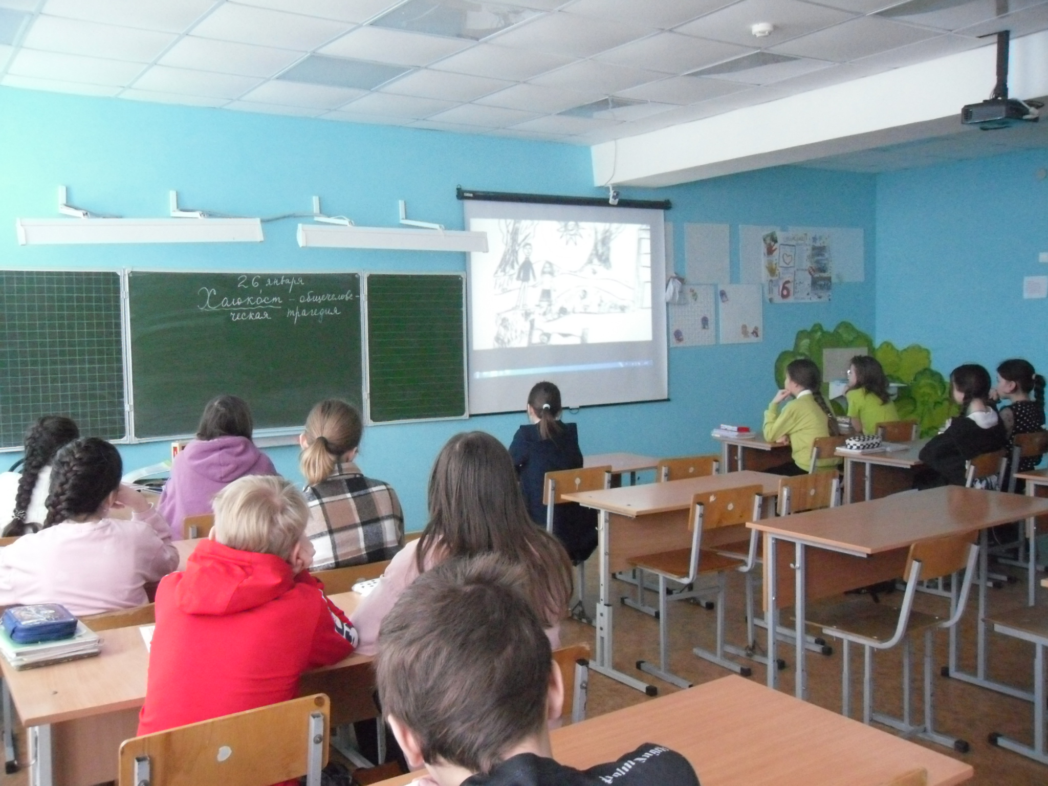 О страшном периоде преследования и массового уничтожения людей, о концлагеряхрассказали ведущие на уроке истории. Рассказ сопровождался видеорядом о жертвах Холокоста, а также проникновенными строками М. Джалиля.