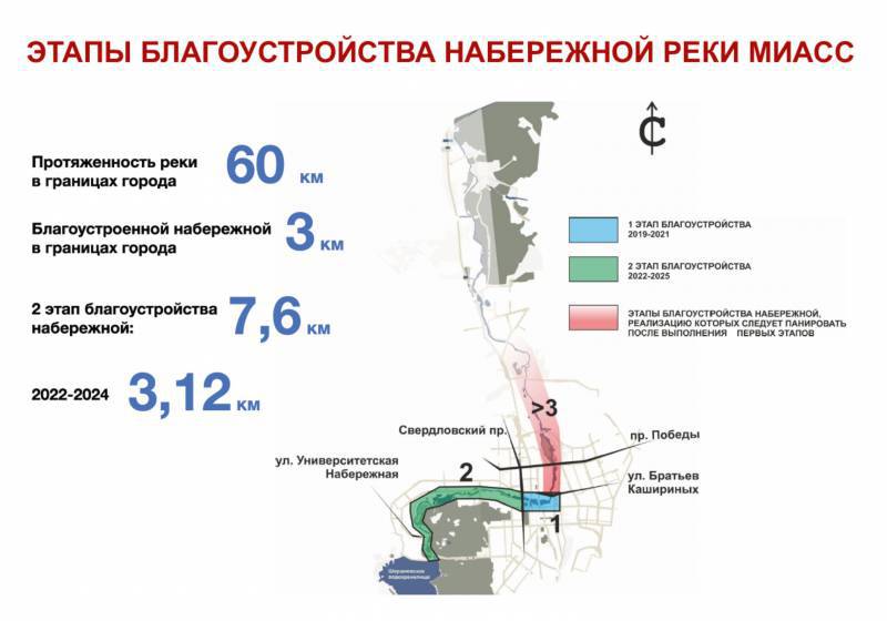 В рамках второго этапа благоустройства определены 12 участков набережной реки Миасс в границах от Свердловского проспекта до ул. Академика Королева. Реализацию благоустройства планируется осуществлять как за счет бюджетных, так и внебюджетных средств.