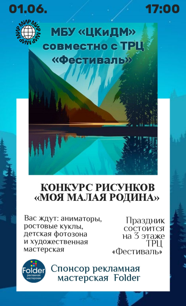 Центр культуры и досуга молодежи совместно с торгово-развлекательным центром «Фестиваль», объявляют конкурс к Дню защиты детей «Моя малая Родина».