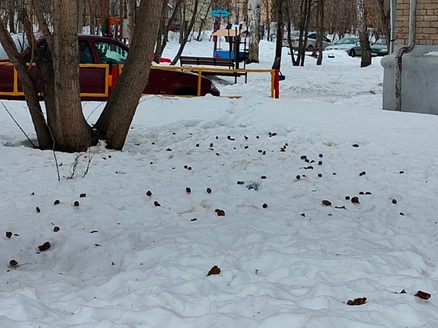 Видите россыпь тёмных штучек на снегу? Это не шишки. Сосен по близости не наблюдается.