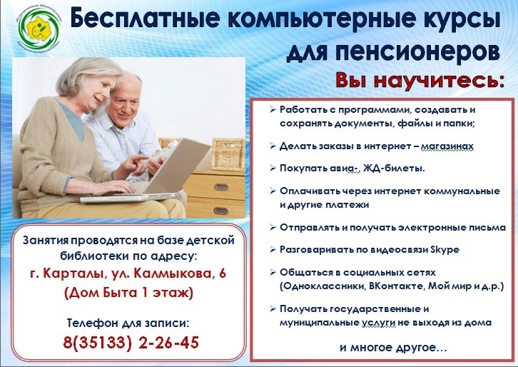 Муниципальное учреждение «Централизованная библиотечная система» Карталинского муниципального района приглашает лиц старшего поколения на курсы обучения компьютерной грамотности.
