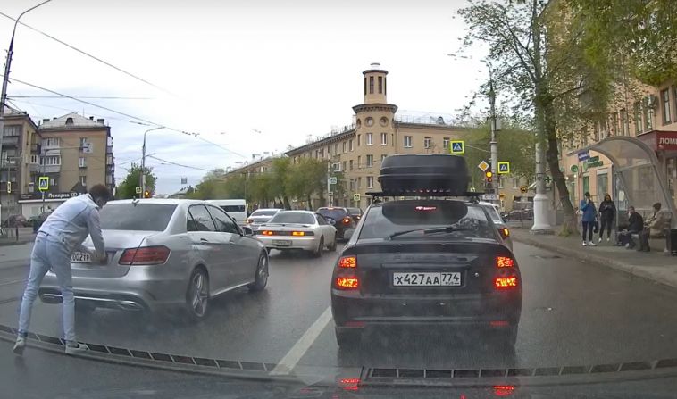 фото: группа "На дорогах Магнитки! (Магнитогорск)" / "ВКонтакте"В Магнитогорске водитель «Мерседеса» решил не дожидаться, когда загорится «зеленый» на светофоре — мужчина объехал пробку на запрещающий сигнал. А чтобы избежать штрафа за нарушение правил, автомобилист предварительно вышел из иномарки и снял номера. Вот только уйти от ответственности не получится — его действия заснял видеорегистратор. Запись с правонарушением опубликовал очевидец в одной из местных групп в соцсети «ВКонтакте»:
