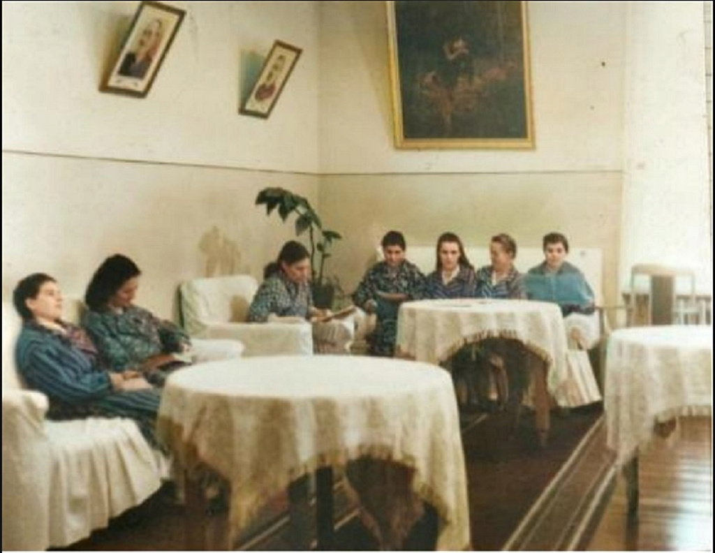 Комната отдыха родильного отделения больницы. Слева - два портрета вождей партии, а картину на стене узнаёте?