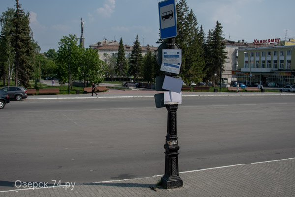 На остановке у ДК «Маяк» в художественном беспорядке висят таблички с расписанием.