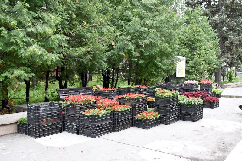 Сегодня с утра на площади перед театром драмы и комедии «Наш дом» начали преображаться три большие клумбы. Саженцы из транспортировочных ящиков постепенно перемещаются на свое постоянное место, и очень скоро цветочный рисунок ляжет на черное полотно чернозема. Здесь высаживают такие растения, как сальвия, цинерария, петуния, тагетис, агератум, колеус.