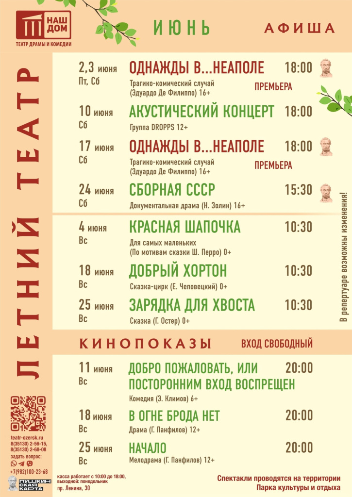 Есть добрые новости и для любителей кино. Социальный партнер театра «Наш дом», Челябинский Киноцентр им. Сергея Герасимова предоставил несколько фильмов для просмотра. 11 июня под сводами летнего театра можно посмотреть комедию «Добро пожаловать или Посторонним вход воспрещен». 18 июня будет показана драма «В огне брода нет», а 25 июня мелодрама «Начало».