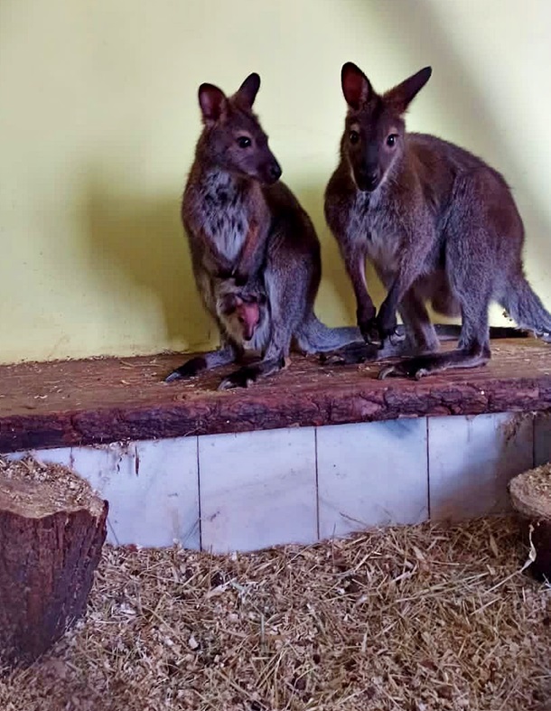 В семействе кенгуру в детском эколого-биологическом центре Озерска появился малыш. Причем, увидели его случайно: Аннушка прятала свое чадо в сумке. Беременность кенгуру длится недолго, всего 40 дней, а малыш рождается крошечным, весом всего в 1 грамм. Почти сразу он тянется к сумке и «заселяется» туда на откорм. В сумке матери кенгуренок может пролежать 6-8 месяцев.