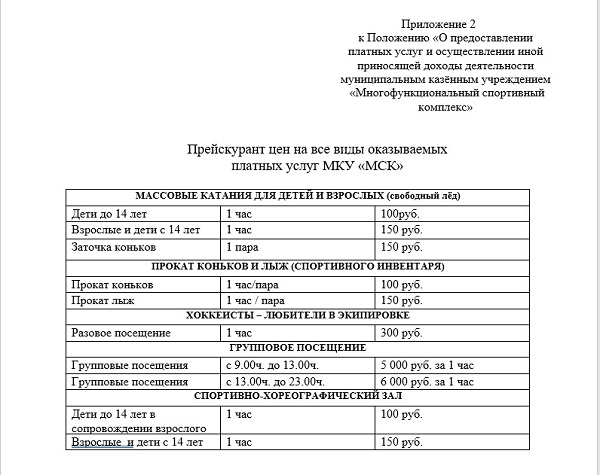 Прейскурант цен на платные услуги составлен с учётом знакомства с ценами аналогичных спортивных объектов в других городах Челябинской области.