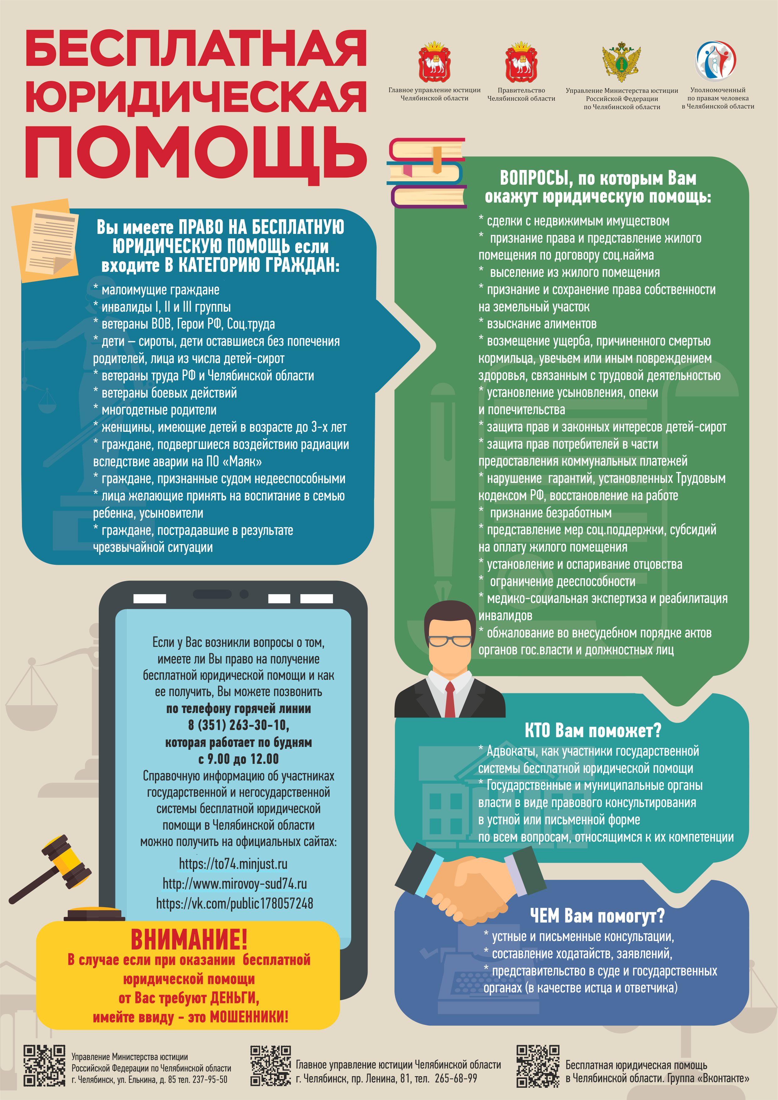 Горячая телефонная линия по бесплатной юридической помощи открыта Главным управлением юстиции Челябинской области с целью информирования граждан о порядке оказания бесплатной юридической помощи на территории Челябинской области.