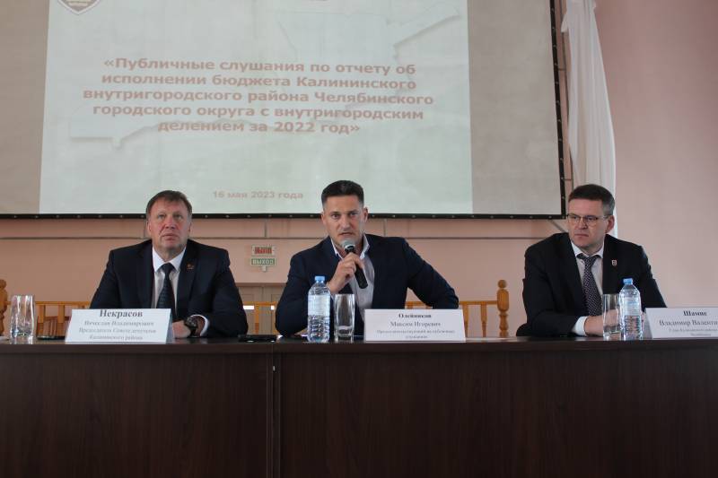16 мая 2023 года в актовом зале Администрации Калининского района состоялись публичные слушания по проекту решения Совета депутатов Калининского района города Челябинска «Об исполнении бюджета Калининского внутригородского района Челябинского городского округа с внутригородским делением за 2022». На публичных слушаниях присутствовали жители Калининского района, депутаты Законодательного собрания Челябинской области, депутаты Челябинской городской Думы, депутаты Совета депутатов Калининского района и представители общественных организаций. В состав Президиума публичных слушаний вошли: