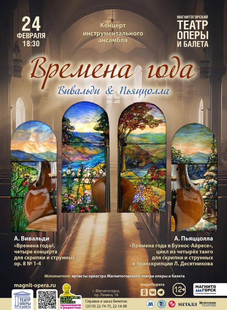 Вы услышите в исполнении артистов оркестра Магнитогорского оперного театра шедевры двух великих композиторов. Цикл из четырёх концертов для скрипки и струнных Антонио Вивальди и цикл из четырёх танго для скрипки и струнных Астора Пьяццоллы в транскрипции Леонида Десятникова.