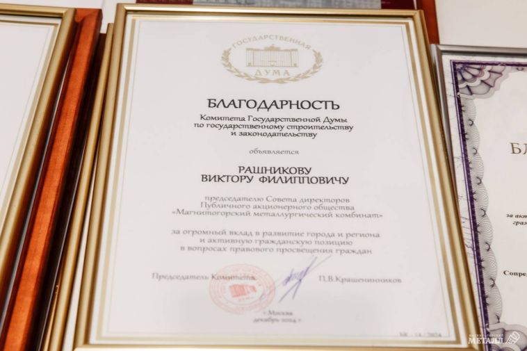 – Без моральной и материальной поддержки Виктора Рашникова и Сергея Бердникова невозможно было бы развитие города.Глава думского комитета вручил благодарственные письма. Глава Магнитогорска Сергей Бердников получил письмо лично, а награду, предназначавшуюся председателю совета директоров ПАО «ММК» Виктору Рашникову, вручили генеральному директору ПАО «ММК» Павлу Шиляеву. Благодарности комитета Государственной Думы РФ по государственному строительству и законодательству Виктор Филиппович удостоен «за огромный вклад в развитие города и региона и активную гражданскую позицию в вопросах правового просвещения граждан».