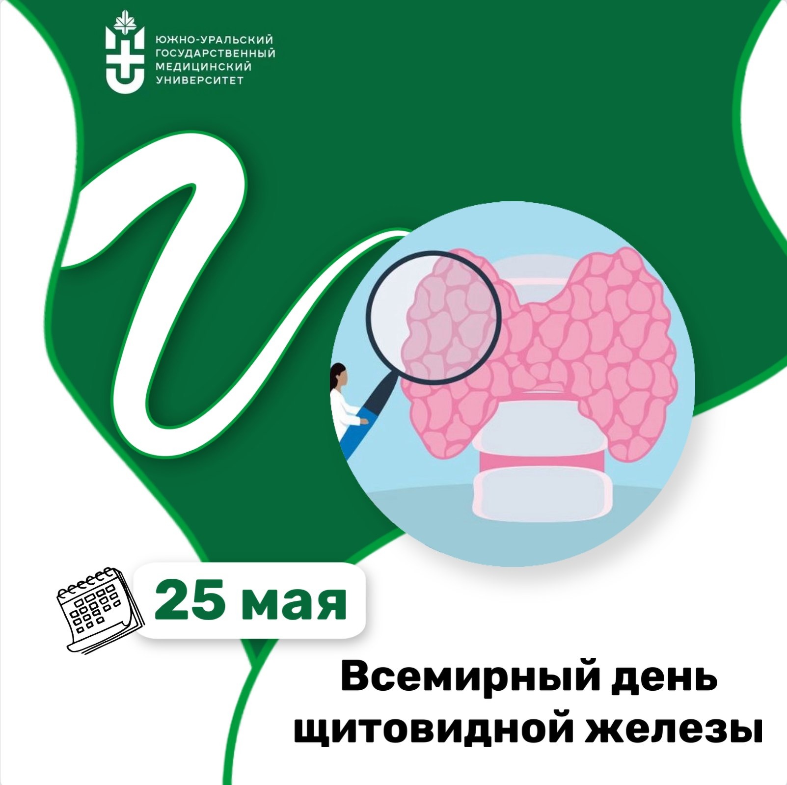 25 мая во всём мире отмечается Всемирный день щитовидной железы. В этот день проводятся мероприятия, направленные на повышение осведомлённости людей о заболеваниях щитовидной железы, методах их лечения и профилактики.