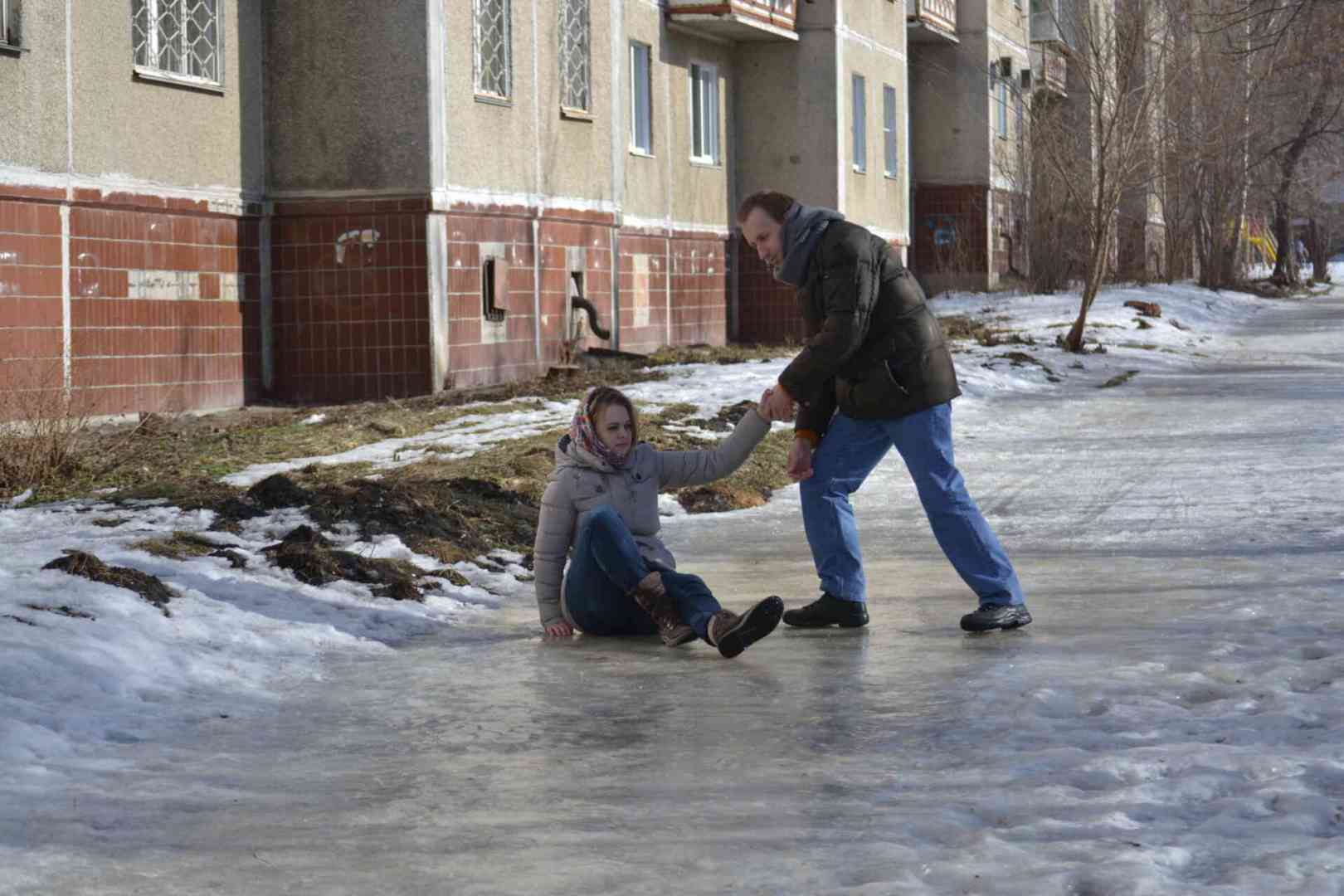 Что делать после падения? Не спешите сразу же бодро вставать. Резкий подъем может привести к тяжелым последствиям, если полученная при падении травма окажется серьезной. Даже если травма тяжелая, в первые секунды резкой боли можно не почувствовать, так как организм еще находится в шоковом состоянии. Если человек сразу после падения встал и пошел, это не значит, что у него нет, например, повреждения позвоночника или перелома ноги. Адреналин, который выбрасывается в момент стресса, может маскировать боль. После падения сначала приподнимите голову, пошевелите руками и ногами, прислушайтесь к своим ощущениям. Поднимайтесь только в том случае, если действительно не чувствуете острой боли. Помните, что боль может прийти не сразу, поэтому идеальным решением после падения будет посещение травмпункта. Риски и последствия при падении На локоть — перелом ключицы, плечевой кости и локтевого отростка локтевой кости. На вытянутую руку — перелом костей, образующих локтевой сустав (возможно со смещением или осколками), травма запястья. На ягодицы — компрессионная травма позвоночника. На спину — удар головой и сотрясение мозга. На колено — травма надколенника. Чувствуете, что падаете — как правильно упасть? Сильно согните колени, будто приседаете; Машите руками — чем больше амплитуда, тем больше шансов удержаться на ногах; Постарайтесь за что-нибудь ухватиться; Если вы падаете на спину, как можно шире раскиньте руки, чтобы уменьшить силу удара и не приземлиться на локти, постарайтесь притянуть голову к груди, чтобы не удариться затылком; Если вы падаете на бок, максимально сгруппируйтесь, постарайтесь подтянуть ноги к груди, не вытягивайте руки, локти прижмите к телу, постарайтесь приземлиться на предплечье. Как же передвигаться на скользких участках?Шагать прямо — неправильно. Ведь когда мы передвигаемся по сухой дороге, вес тела распределяется примерно одинаково на каждую ногу. По скользкой же дороге ногам приходится подпирать тело под углом, а не перпендикулярно. В результате опорная нога «едет» и человек падает.