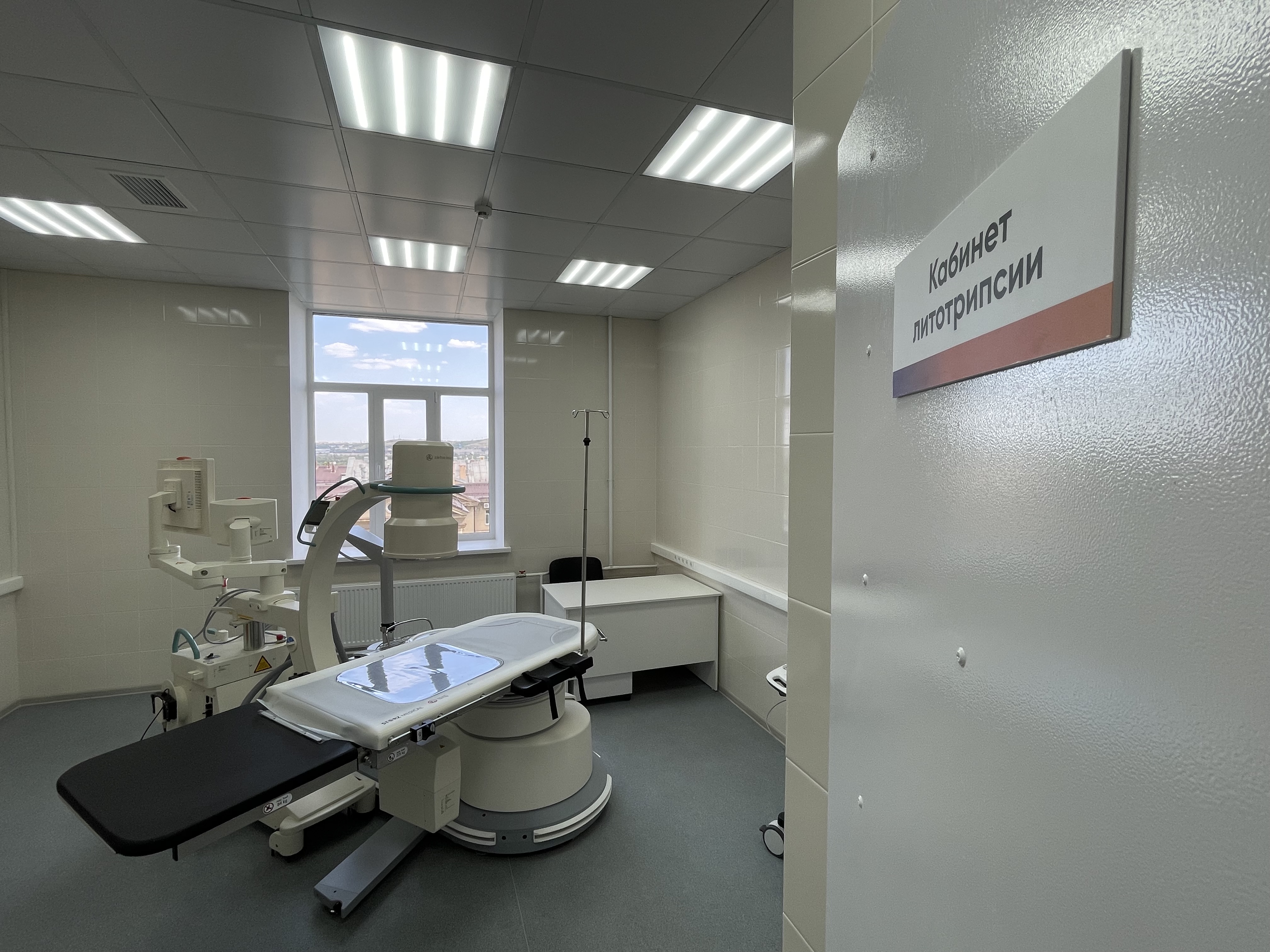 В левом крыле расположились комфортабельные палаты: каждая оборудована многофункциональными кроватями, кондиционерами, системой вызова медицинского персонала, санузлом и душевой (что принципиально как с точки зрения современной медицины, так и специфики пациентов). Всего в отделении развернуты одна четырехместная и 8 двухместных палат. Холл и правое крыло отданы под «рабочие» помещения отделения урологии - процедурные, смотровые, УЗИ - кабинеты. Здесь же монтируется стационарный литотриптор MODULITH SLX-F2 швейцарской фирмы «Storz» - полноценная урологическая рабочая станция, сочетающая в себе все необходимые инструменты для мультимодальной терапии мочекаменной болезни.