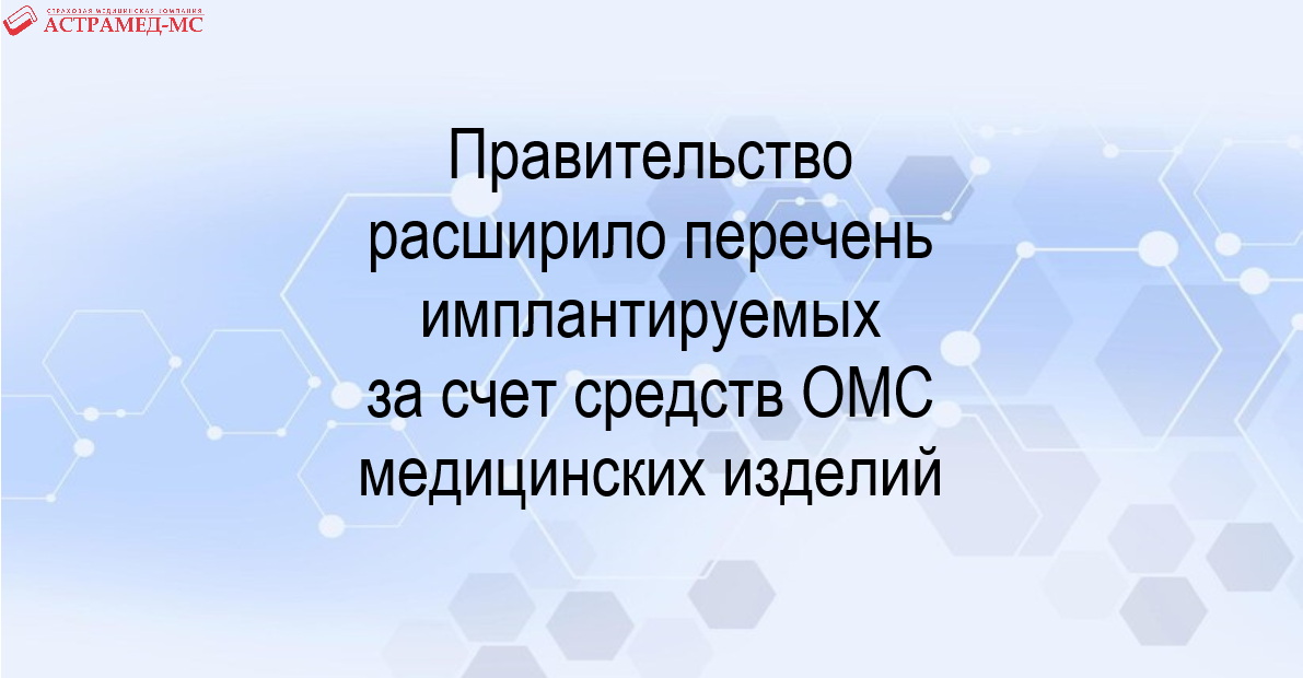 Правительство расширило перечень медицинских изделий, которые могут быть имплантированы пациенту за счет средств ОМС. Добавлена одна позиция. Правительство добавило еще одно медизделие в перечень имплантируемых в организм пациента за счет средств ОМС. Распоряжение опубликовано на сайте кабмина.