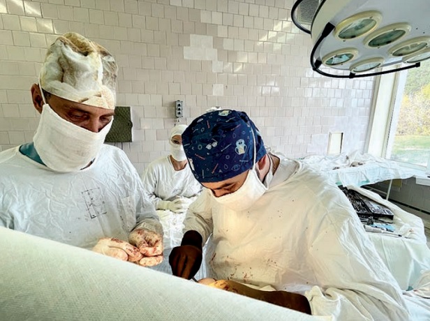За работой врач-онколог Евгений Чеботаев (слева), врач-травматолог-ортопед Дмитрий Бурматов (справа) и операционная медсестра Алёна Чухманская