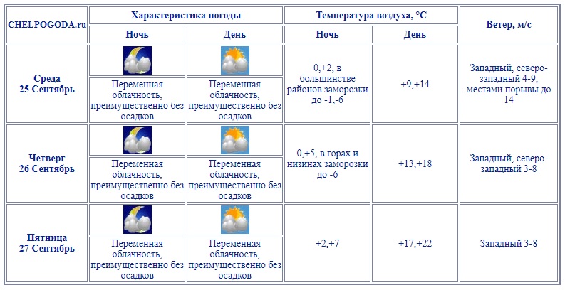 В среду, 25 сентября, погода в регионе будет преимущественно облачной, без осадков. Ночные температуры опускаются до -1...-6 градусов, поэтому рекомендуется утеплиться. Днем воздух прогреется до 9...14 градусов, что вполне комфортно для осенней прогулки. Ветер западного и северо-западного направления будет умеренным, но порывы могут достигать 14 м/с.