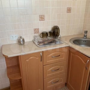 Все есть для комфортного проживания - кухня, обеденная зона, письменный стол, кровать, плита, холодильник, стиральная машина.